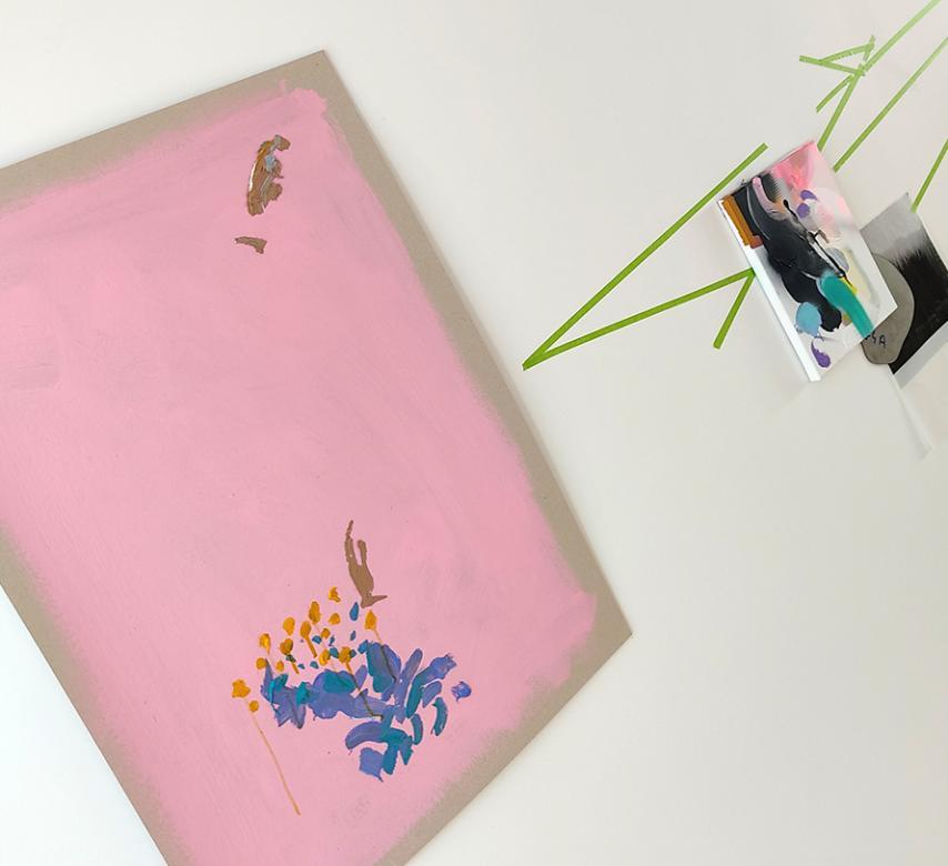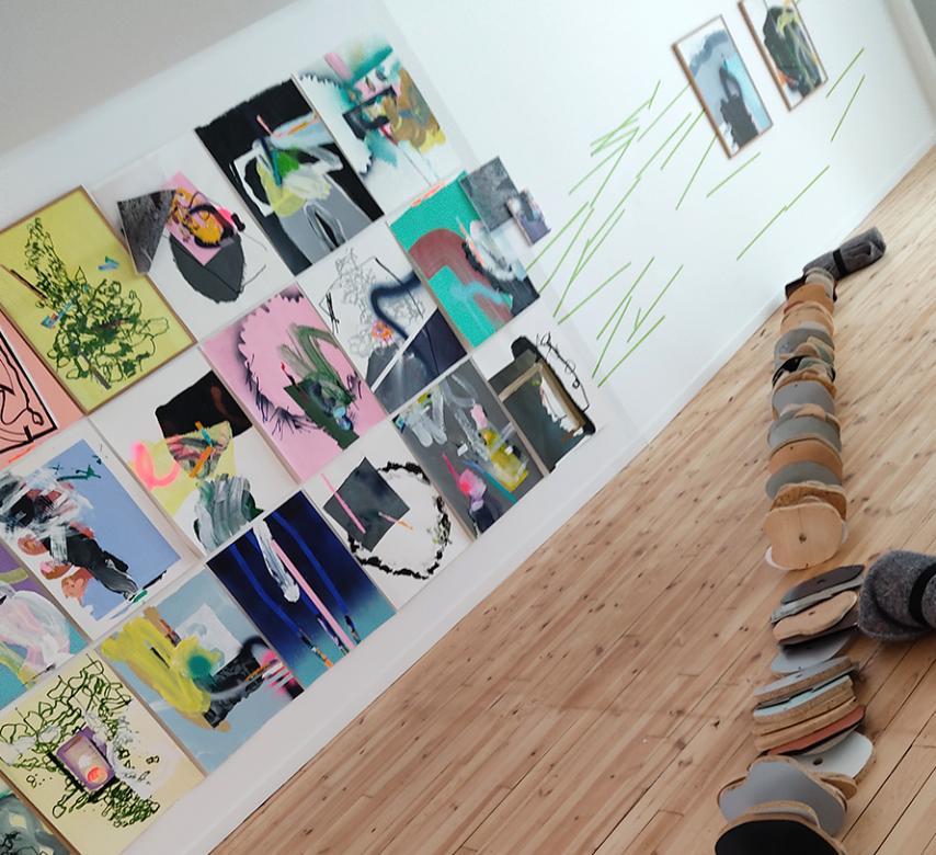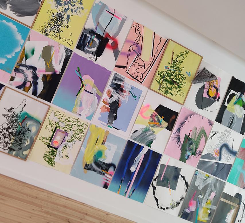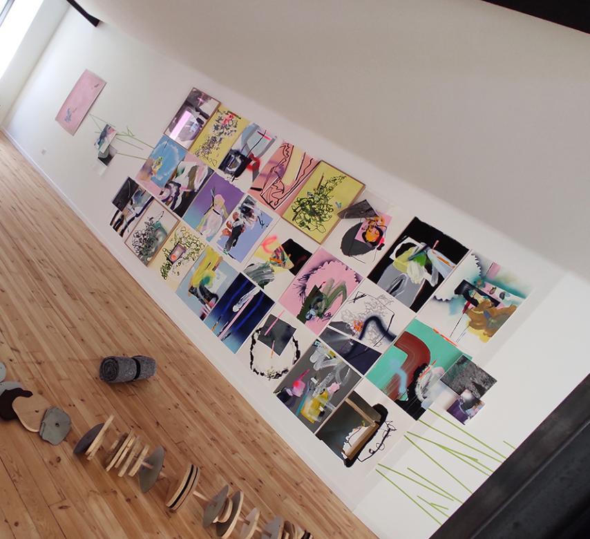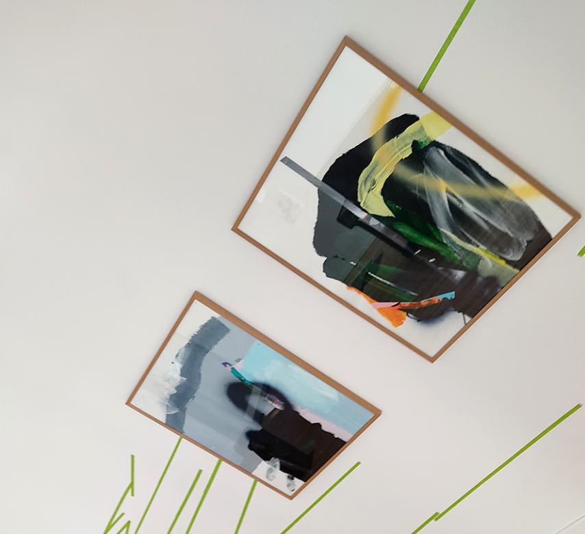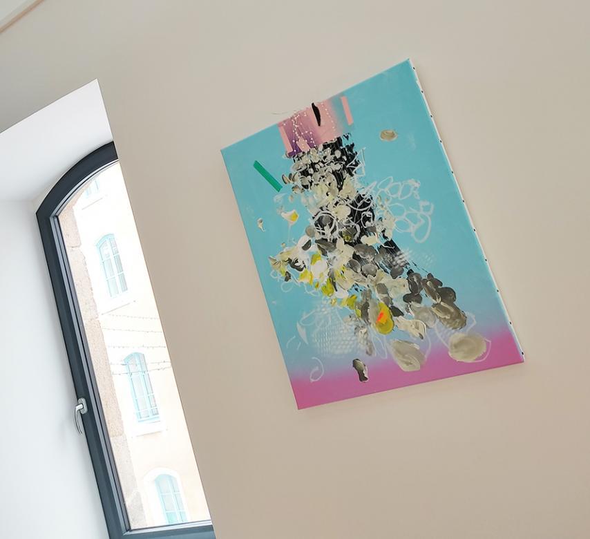 2- Fiction… des eaux noires du lac, il faut ensuite remonter à la surface… au premier étage, pour voir s’ouvrir un horizon coloré... un ensemble d'œuvres sur papier réalisées à la fin de l’année 2022 et au cours de l’année 2023. Elles traduisent la sérénité du travail d’atelier dans ce nouveau lieu de création et ce nouvel environnement. Ici, ce sont des paysages abstraits et des points de vue qui s’ouvrent… lumineux (jaune, rose, vert, bleu…). Encadrés ou non, jouant sur le rythme aéré, le dialogue ou l’accumulation, les œuvres ont une dimension individuelle et collective. Les lignes vertes les relient comme un trait d’union… comme un chemin… et définissent une autre forme d’itinérance du spectateur. Comme au fil d’une lecture, il ne peut pas s’égarer et il revient à la ligne pour saisir son environnement par le regard… clignement des yeux et champ visuel. Il y a ce que l’on voit, ce que l’on retient et l’au-delà… entre les lignes… ce qui n’est pas représenté et ce qui est blanc autour. Ce qui reste… sur les murs comme dans l’esprit… c’est le mémorable… cet éboulis de souvenirs imprimés comme des mots derrière nos paupières au retour d’une promenade. Ces œuvres, comme des prises de vue photographiques, capturent l’essentiel… dans un mélange d’acrylique, de pochoirs et de bombes aérosol. Dans l’ordre s’invite parfois un peu de chaos, lorsque des formes, des images se superposent et viennent surprendre et réintroduire une forme d’aléas de la nature… comme un détail… un gros plan en surimpression. Il y a une part d’inattendu, une collision accidentelle, qui rend le tout vivant.