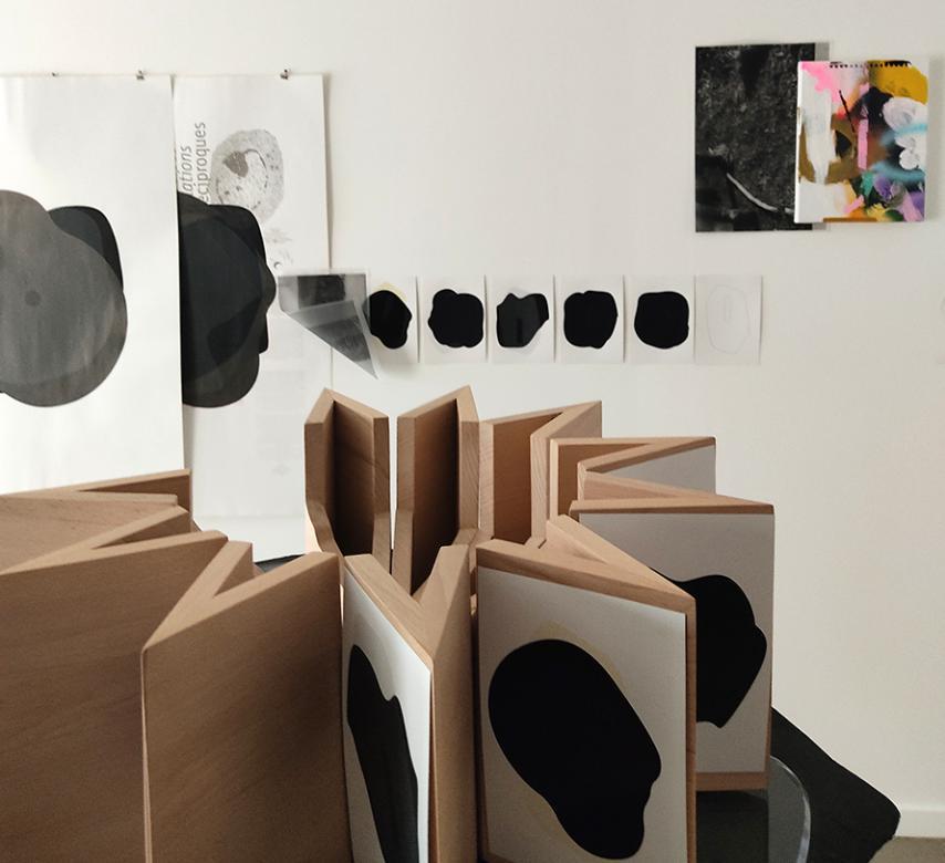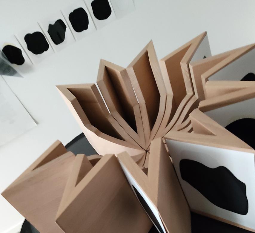 Au centre, la scénographie donne une nouvelle dimension à ces cartes sérigraphiées et au lac lui-même. Elle les anime et invite à une nouvelle interaction avec le spectateur. Il ne s’agit plus d’un face-à-face mais d’une danse. Il faut tourner autour de ce support en bois, comme une étoile facetée et fragmentée… Il faut s’y étourdir comme dans un manège ou un praxinoscope. On y retrouve un rayonnement et le dénivelé intérieur du lac… son épaisseur et sa profondeur… comme un livre à ciel ouvert. Il faut y plonger et prendre part au paysage… à la constellation. On y remarque des similarités et des disparités… celles du lac qui se met en mouvement à la manière d’une chronophotographie… ou d’une chorégraphie entre l’être et le reflet. A travers le spectateur, la circularité du lac rencontre la linéarité du temps et chaque expérience devient unique.