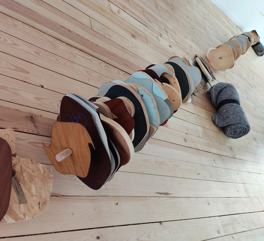 Au sol, se trouve enfin une machine… une mécanique… un sillage ou un effondrement du lac. Il devient une ligne brisée, aux allures de vestige volontaire ou involontaire… d’archéologie contemporaine. L’accumulation prend du volume et la ligne traverse la forme comme un seul corps… uni et fracassé… solide et liquide. On retrouve des strates et une sédimentation du lac… comme autant de jours, de saisons et d’humeurs… un carottage comme un échantillon d’histoire et d’existence à un moment donné… celui de la marche. La forme, ses courbes aléatoires, arborent différentes couleurs, tranches, textures ou épaisseurs (bois, formica…)… réutilisant les matériaux comme un chemin où d’autres sont déjà passés avant nous… la découpe et la brûlure du temps. Recycler, revivre, réinventer notre position et tracer son chemin comme un bout du monde et une frontière sensible entre l’ici et l’au-delà… une ligne droite ou un détour entre nous et nous-mêmes.