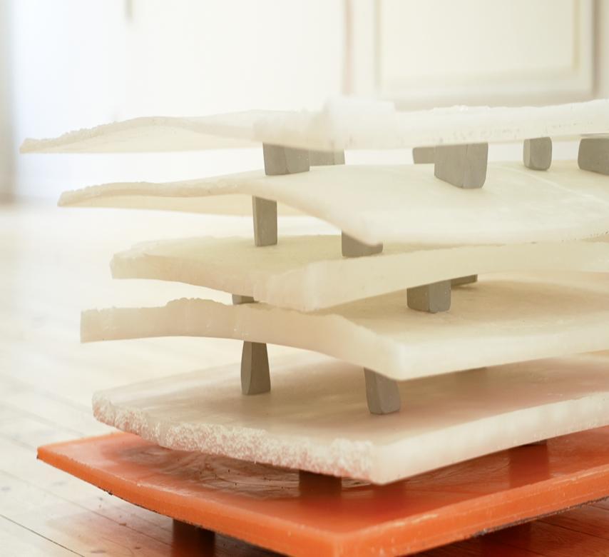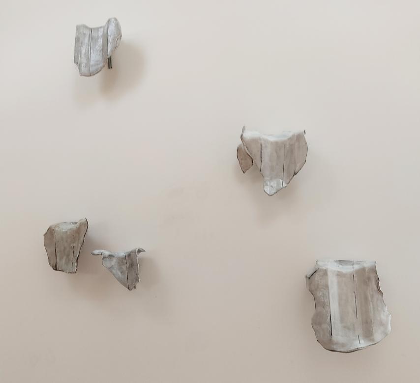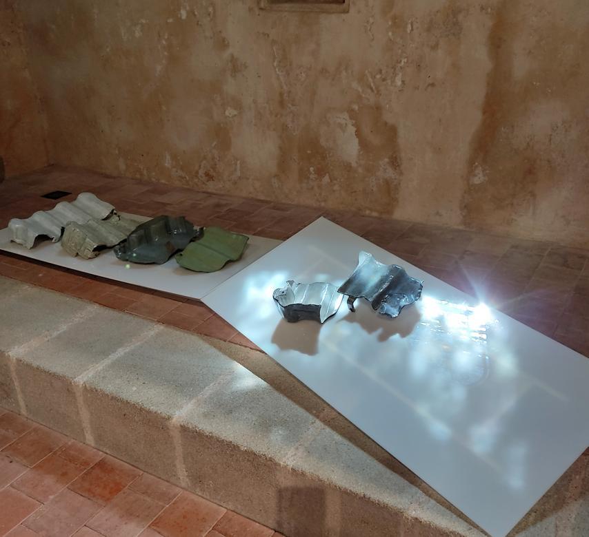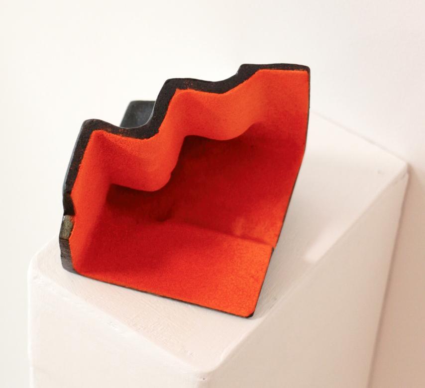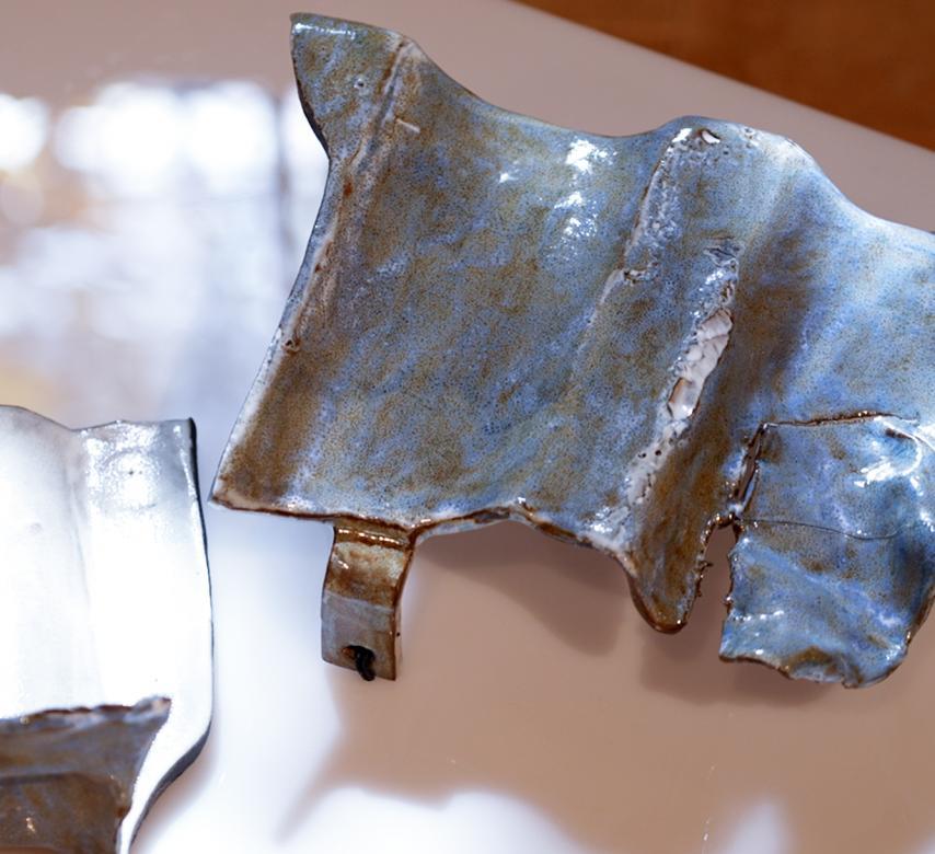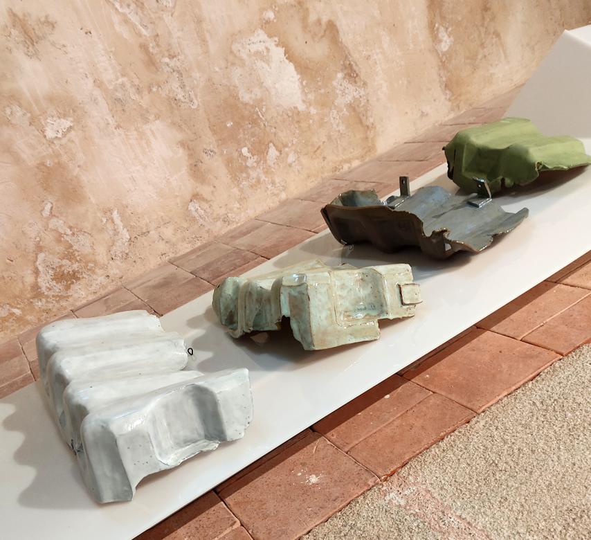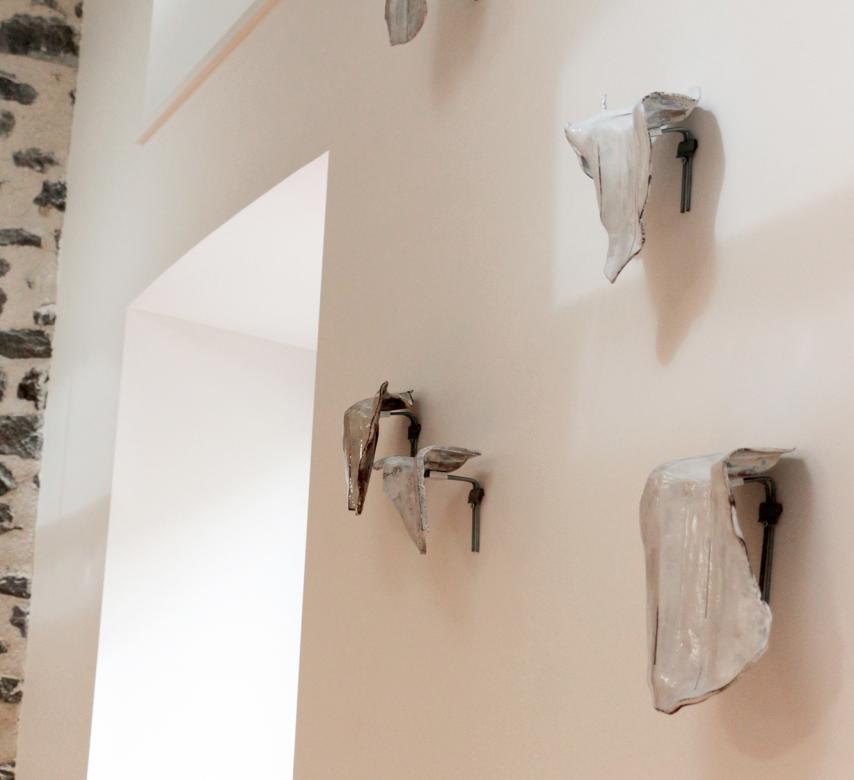 La fragilité tutoie une forme de résilience lorsque la céramique vient, comme une seconde peau, cicatriser les plaies du temps. A la manière du kintsugi, l'œuvre-oxymore vient souligner et sublimer les contours au lieu de les dissimuler ou de les effacer. Elle témoigne de la mobilité de la ligne et de l’architecture. Elle en devient le pansement et la mue. Les différents éléments de la composition et de l’installation ont un minimalisme éloquent, une sobriété précieuse et presque liturgique qui surgit par touche de orange comme un cri de joie.