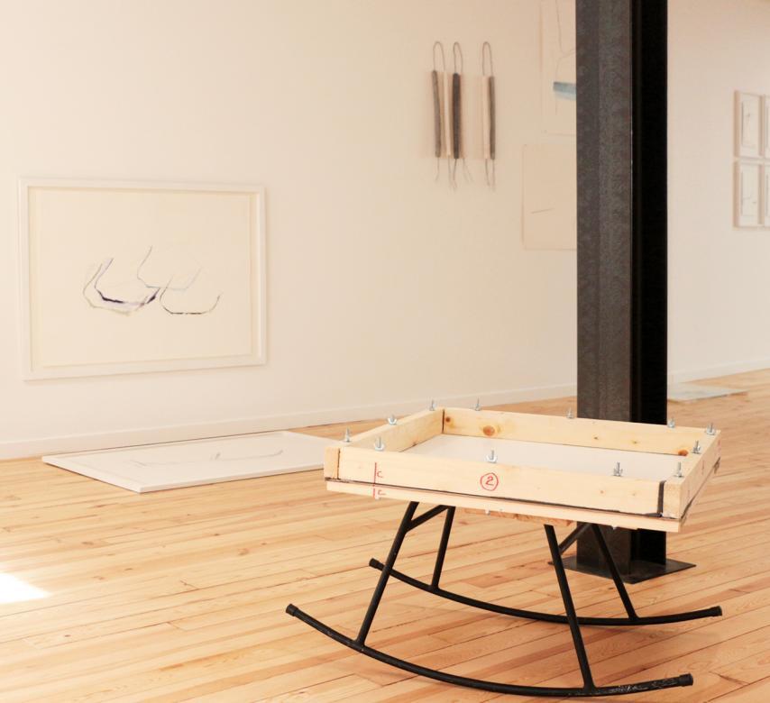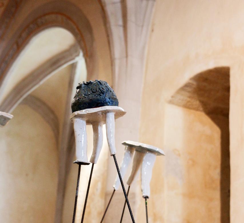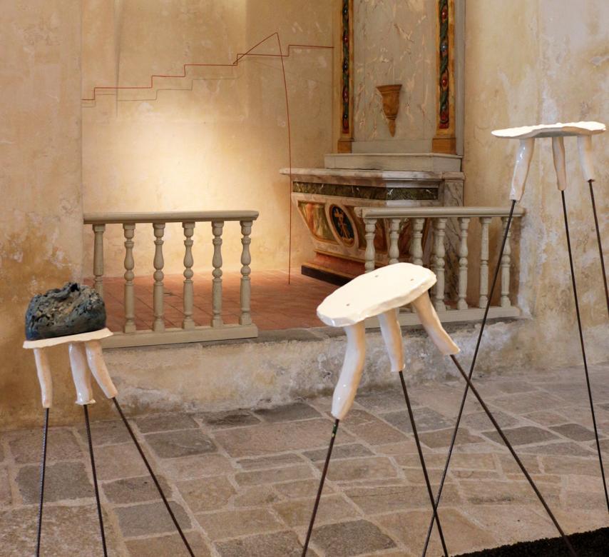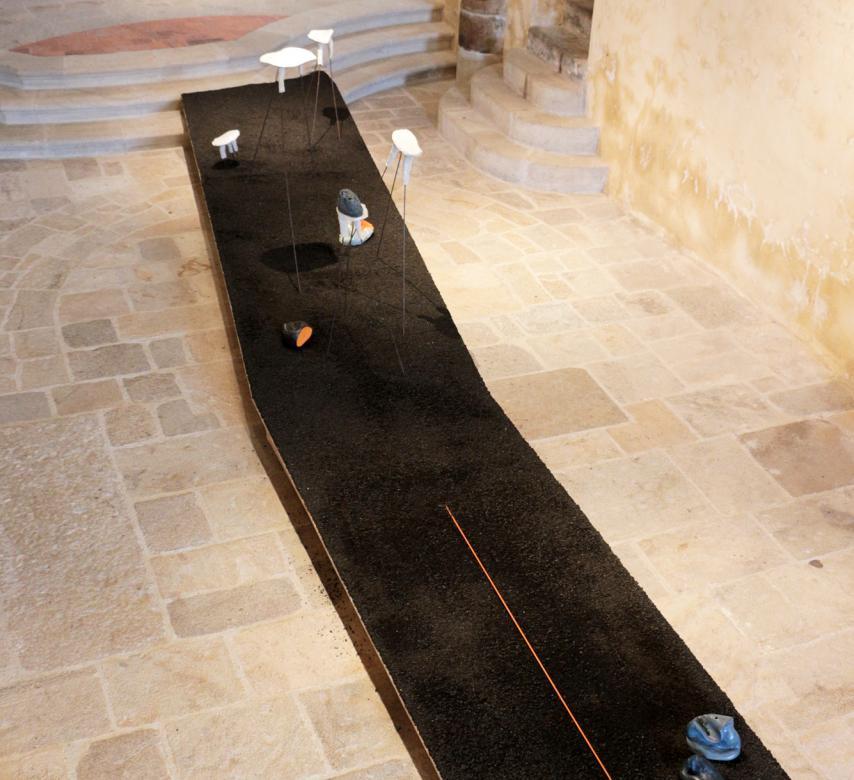 Une ligne de couleur devient une illusion fantômatique lorsqu’elle change de position et de dimension dans le reflet d’un verre de sécurité… la transition entre verticalité et horizontalité, la réfraction, prend une forme d’apesanteur et de magie. L’attraction du retable polychrome du 17e siècle est contrebalancée et glisse vers d’autres perspectives et lignes de fuite dans une forme de théâtralité en mouvement. Le vaisseau de l'église se redresse en quelque sorte et stabilise le visiteur… un passager en état d’immersion. Le plan s’incline, se contorsionne, glisse… quand le bois soutient la pierre et conduit le regard vers le haut. On suit la ligne du doigt comme le temps d’une lecture. Elle prend forme et la pente adoucit les arêtes des marches, lignes et interlignes, comme un accord majeur ! Quant aux céramiques, elles s’élèvent comme une ponctuation gracile, une note haut perchée, à l’équilibre précaire et vertigineux, qui résonne dans l’espace. Elles sont des promeneuses aux allures industrielles et intemporelles qui dialoguent avec l’architecture romane… en parfaite harmonie.