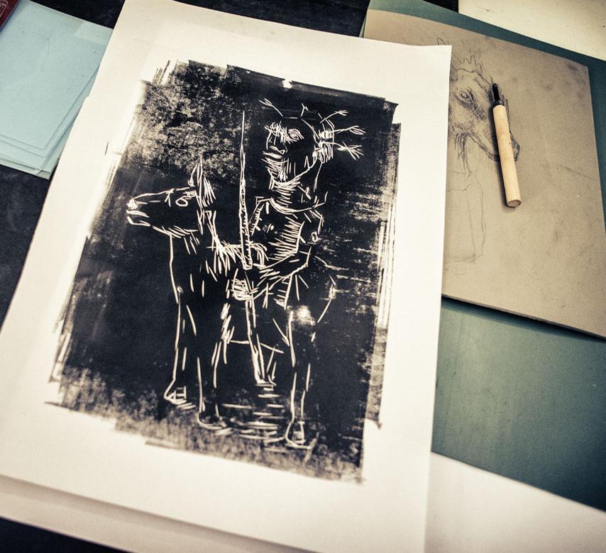 J'ai lancé une piste : "Les mamelles de la louve "et après divers échanges par mail avec les artistes, il a fallu trancher, donc c'est devenu : « La Louve ». Cette fameuse sculpture romaine  m’a toujours intrigué. J'ai retrouvé quelques dessins dans mes carnets. Nous nous sommes rendu compte que cette image était le dénominateur commun. Quand j'ai lancé cette histoire de Louve, chacun avait, par hasard,  fait quelque chose en rapport avec cette image: le dessin de loup de Sandra, la performance  de rue  avec les mamelles d'Eric Angenot , les photos d' épreuves en plâtre prises par Hélène dans les réserves du Louvre, les dessins de Franck et les performances de Rémi dans la forêt.
