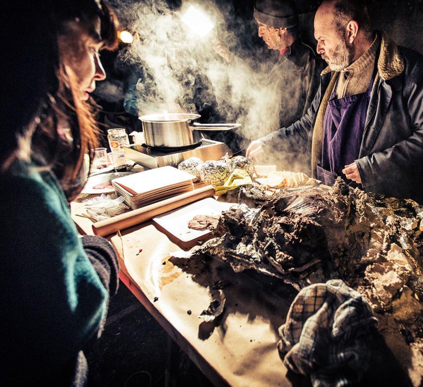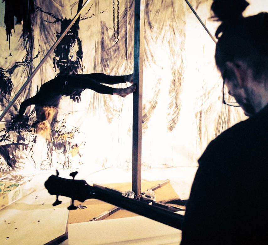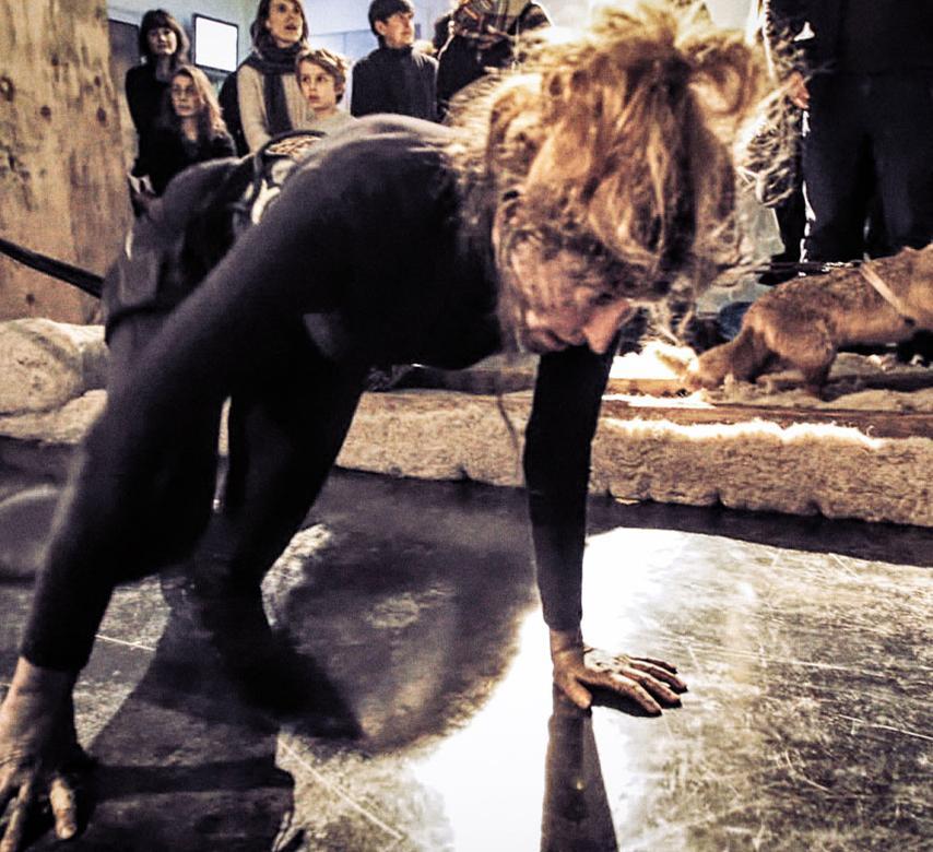 Les artistes de « La Louve » font le choix du sauvage et non de la sauvagerie, en recherchant l’agressivité joyeuse et vivifiante que l’on retrouve dans le Punk, en tant qu’il est « une réaction contre le trop de sophistication, de polissage, de politesse ». L’artiste contemporain Claude Lévêque parle lui aussi d’une jubilation esthétique de l’agressivité, comme dans certains concerts punk ou indus dont il est amateur. Il fait subir en ce sens des stimuli parfois violents aux visiteurs de ses installations environnementales, ceci pour leur faire perdre leurs repères et les engager dans leurs « ténèbres pulsionnelles ». Un vent d’agressivité joyeuse, de Fluxus et de punk flotta au-dessus du vernissage de « La Louve », ainsi qu’un esprit alternatif, underground, terme anglais qui signifie littéralement « sous terre » : visage d’Armand Lestard enduit de terre glaise craquelée par la sécheresse, la même qu’il utilisa dans la semaine pour modeler une version brute de La Louve du Capitole. Grattage de la croûte civilisée par mes cris ponctuant une version électro-punk d’un lied de Schubert célébrant la nature, version fantasmée d’une Diane chasseresse blessée. Frénésie graphique et picturale de Franck Lestard pris dans une séance punk-chamanique de représentation d’animaux sauvages à l’encre noire, sur de grandes feuilles de papier accrochées aux murs. Effort à quatre pattes de Sandra Ancelot luttant contre la force attractive d’un élastique la ramenant inépuisablement en arrière, faisant écho à un renard empaillé harnaché tirant une énorme boule de terre, telle une femme-Sisyphe en action qui s’attachera plus tard dans la soirée, à une poulie géante pour accomplir une chorégraphie volante. Présence invisible d’Eric Angenot caché tout ce temps-là sous un patchwork de survie d’où il déclamera des textes sur la disparition des animaux sauvages. Arrivée mystique de Rémi Voche en manteau de fourrure, portant sur le dos un matelas qu’il venait de traîner sur treize kilomètres avec un fusil inséré dedans, allumant une bougie avant de s’allonger dessus en criant « en chien de fusil ! ». L’espace d’exposition plongé dans l’obscurité, encombré méthodiquement des œuvres mises en commun des artistes dans un processus de déterritorialisation de chacun, fut activé par ces actions performatives.